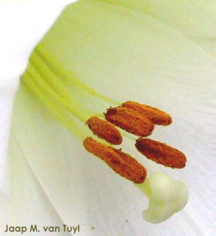 Tepalen weiss, an der Basis aussen leicht grünlich überhaucht,